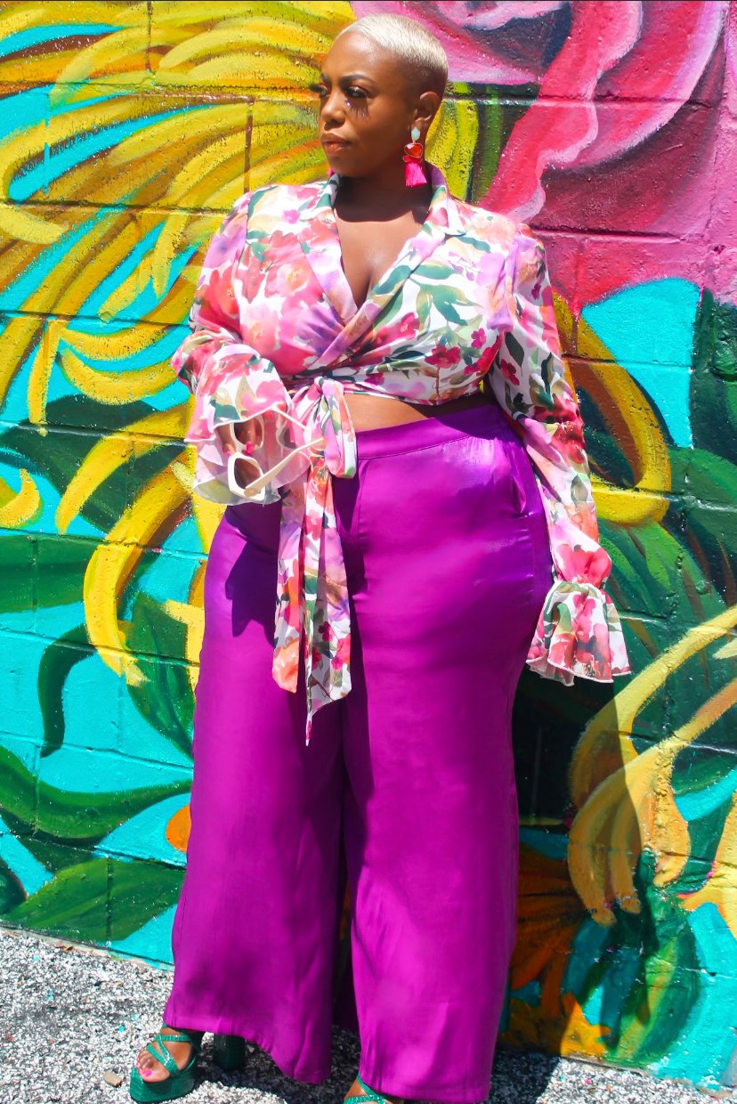 Satin pants with zipper and button closure. Elastic in the back of pants for stretch and comfort.